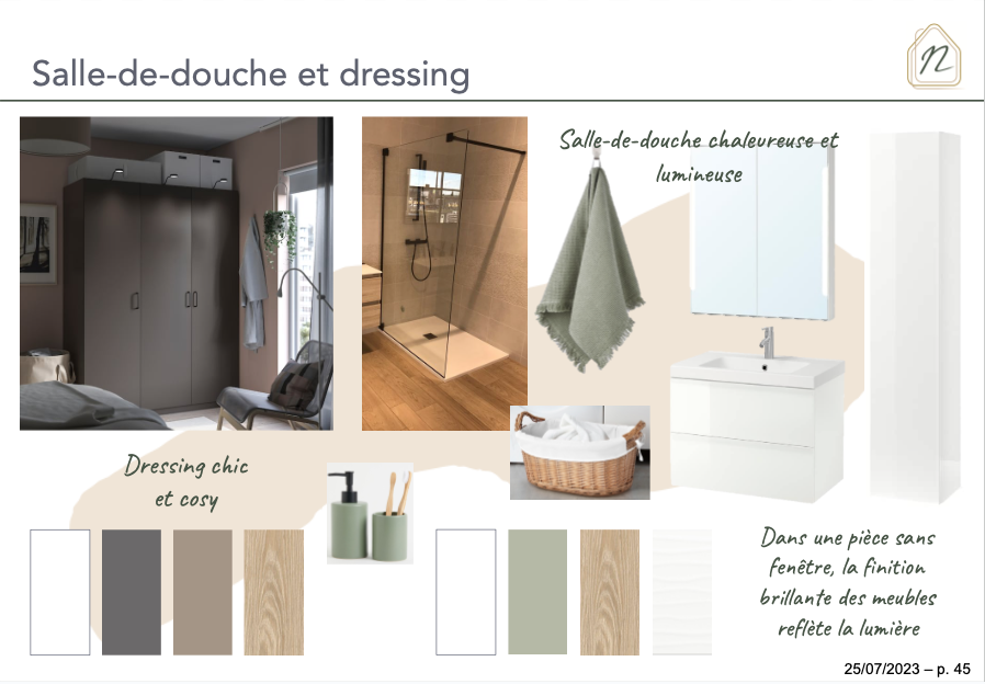 L’ancienne entrée du 2e appartement deviendra un dressing, donnant directement accès à la salle-de-bain qui a également été étudiée. La baignoire sera remplacée par une douche italienne, avec une assise, et l’évier actuel sera remplacé par un meuble vasque de 90cm. Au mur, on trouvera un carrelage blanc et au sol, des lames de PVC imitation bois pour apporter le côté chaleureux.